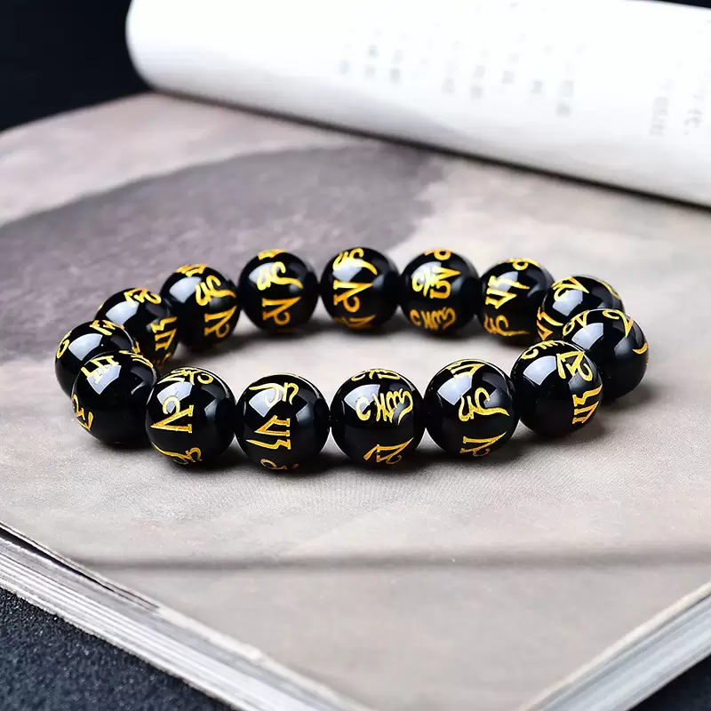 This unique Obsidian Mala Bracelet perfectly blends tradition with fashion. Each Six-Syllable Mantra bead is meticulously carved from natural obsidian, symbolizing powerful spiritual strength and protection. It is suitable for all who seek inner peace and good fortune.