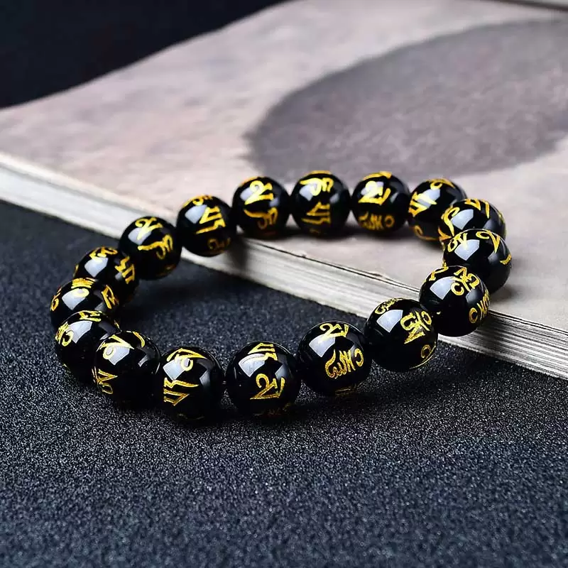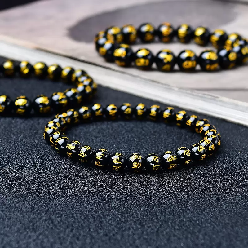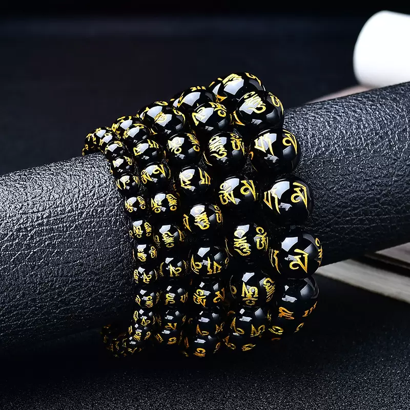 This unique Obsidian Mala Bracelet perfectly blends tradition with fashion. Each Six-Syllable Mantra bead is meticulously carved from natural obsidian, symbolizing powerful spiritual strength and protection. It is suitable for all who seek inner peace and good fortune.