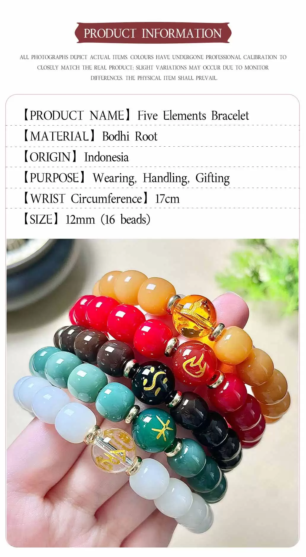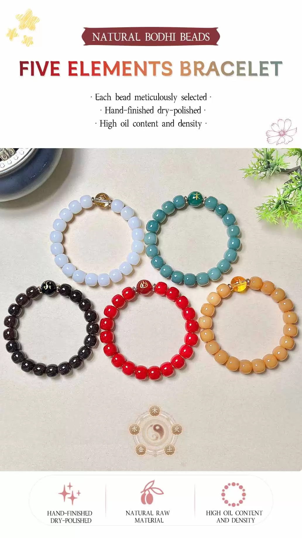 The Natural Five Elements Bodhi Bracelet features authentic bodhi seeds that represent metal, wood, water, fire, and earth, symbolizing harmony and balance in Feng Shui for a powerful five elements bracelet.